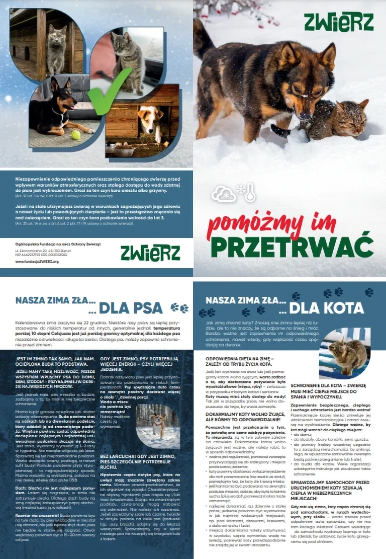 To Twoja sprawa i obowiązek, żeby zadbać o swojego psa. Szczególnie teraz, kiedy na dworze pada deszcz, śnieg i panuje chłód, zwróć uwagę na warunki w jakich utrzymujesz swoje zwierzę! Zimą zwierzę jest narażone na hipotermię, odmrożenia a nawet śmierć.
