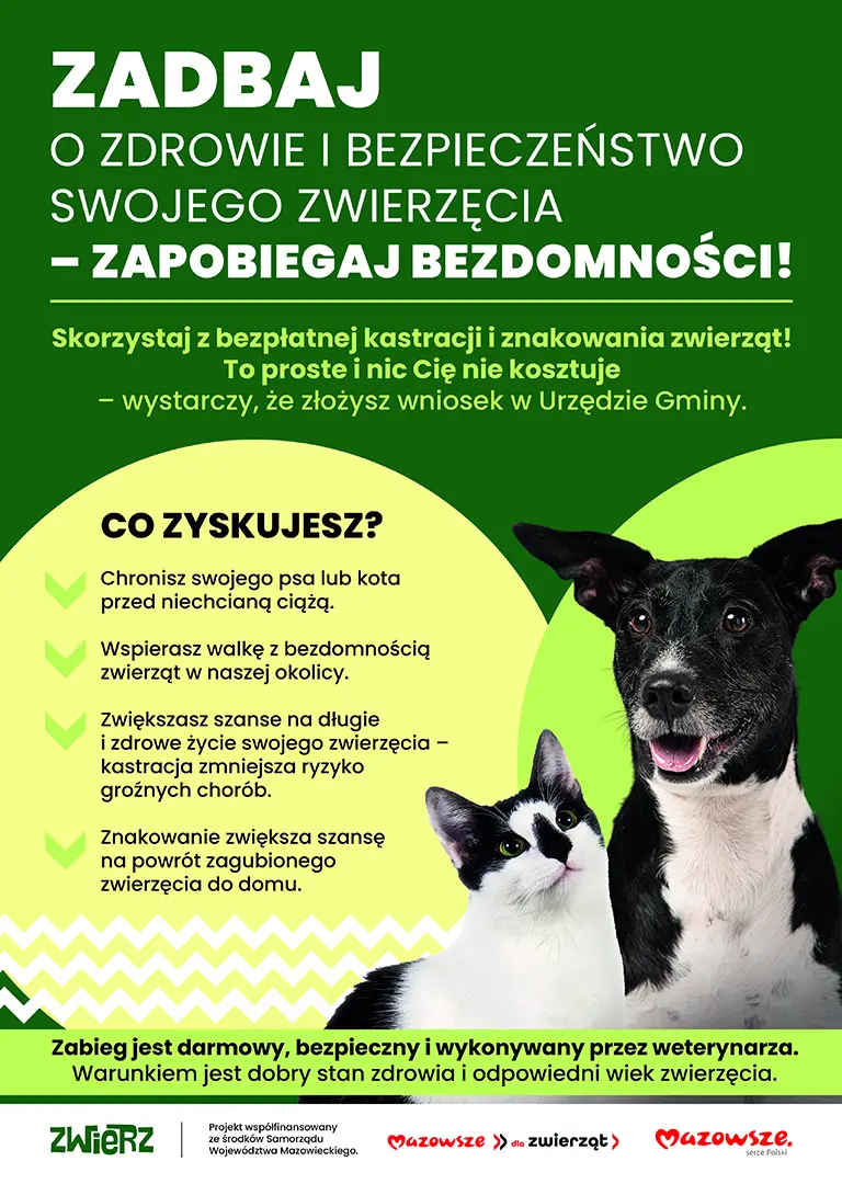 Fundacja Zwierz z dumą wspiera i współpracuje w ramach programu „Mazowsze dla zwierząt”, realizowanym przez Marszałka Województwa Mazowieckiego. To ważna inicjatywa, która ma na celu wsparcie gmin w ograniczeniu bezdomności psów i kotów na terenie Mazowsza poprzez współfinansowanie zabiegów kastracji i znakowania.